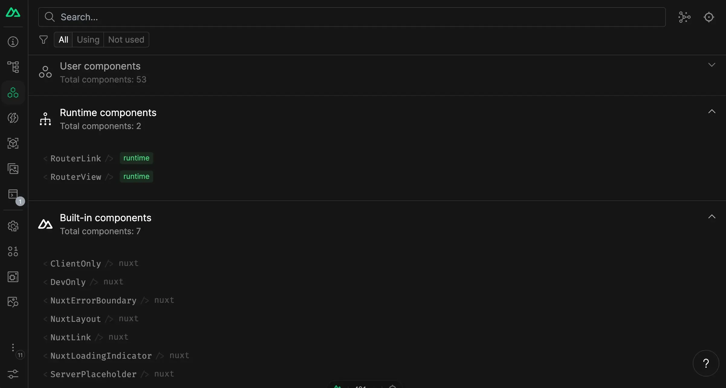 Discover all the auto-imports composables and utils registered in your app. You can see which files are importing them, and where they are from. Some entries can also provide short descriptions and documentation links.